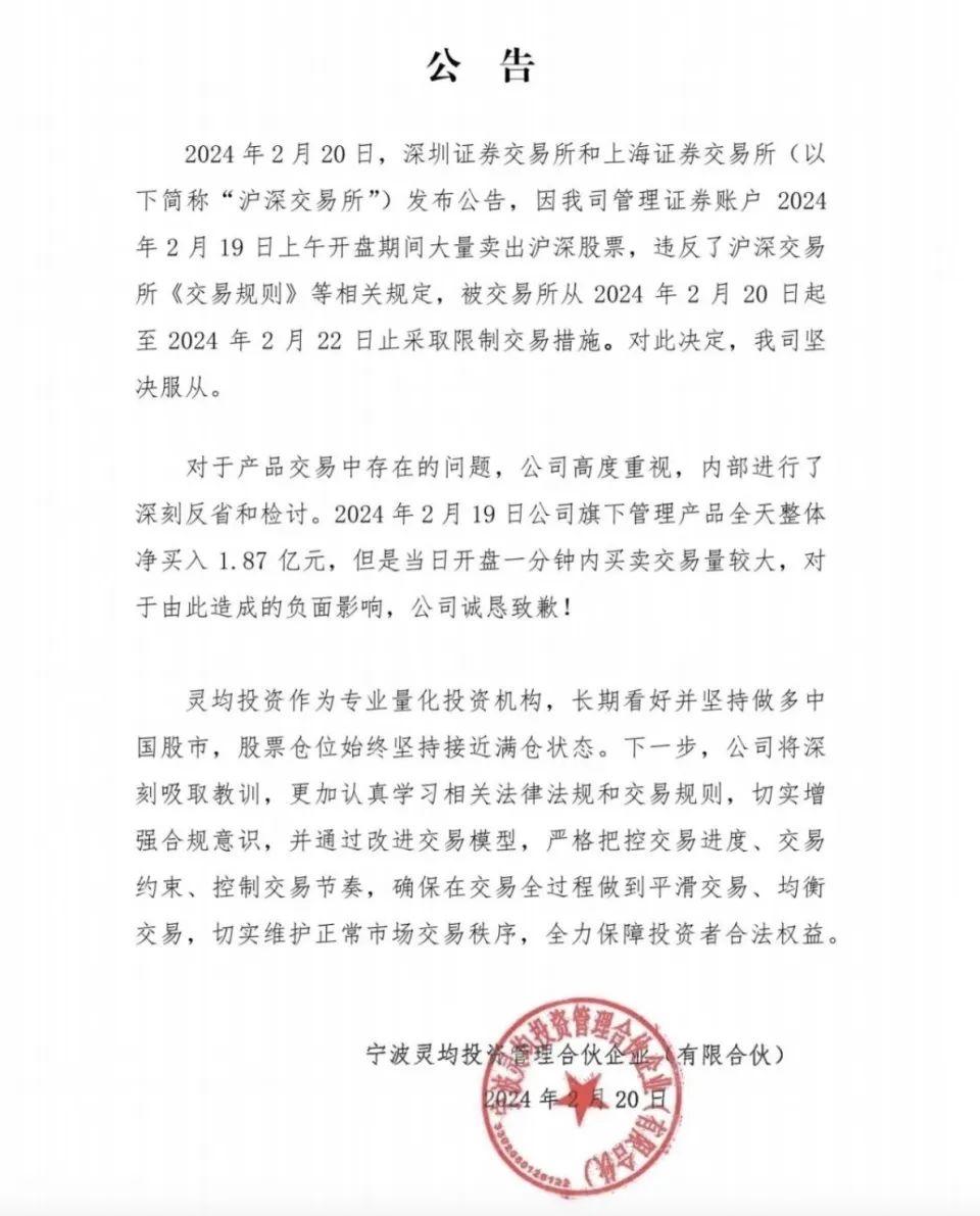 2月21日凌晨2点25分,被处罚的百亿量化私募宁波灵均投资管理合伙企业(有限合伙)(以下简称“灵均投资”)在官方公众号发布公告道歉。