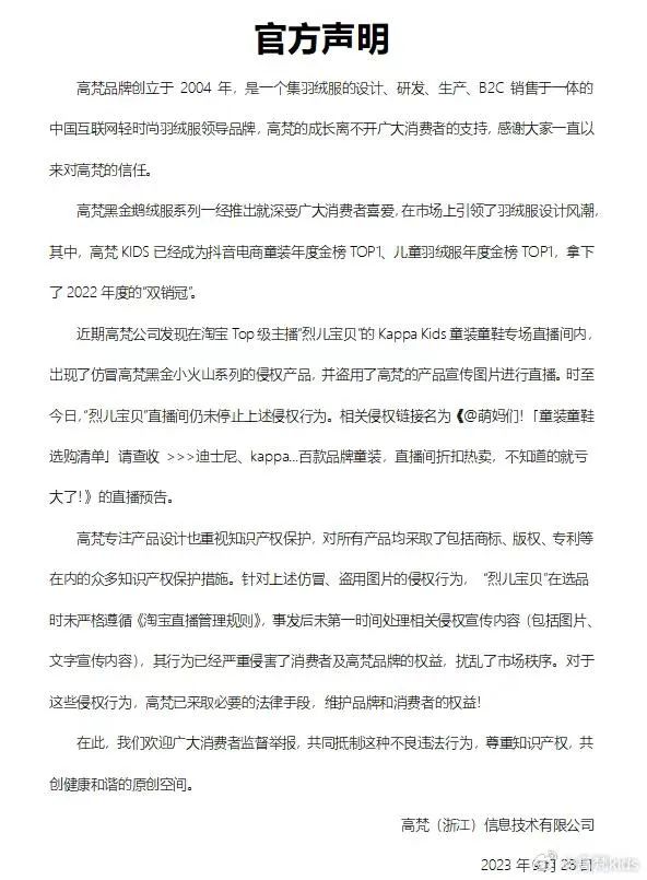 无独有偶,去年9月,高梵kids官方发布声明,称淘宝头部主播烈儿宝贝在Kappa Kids童装童鞋专场直播间带货仿冒自家品牌系列的侵权产品,还盗用了自己的产品宣传图片进行直播。