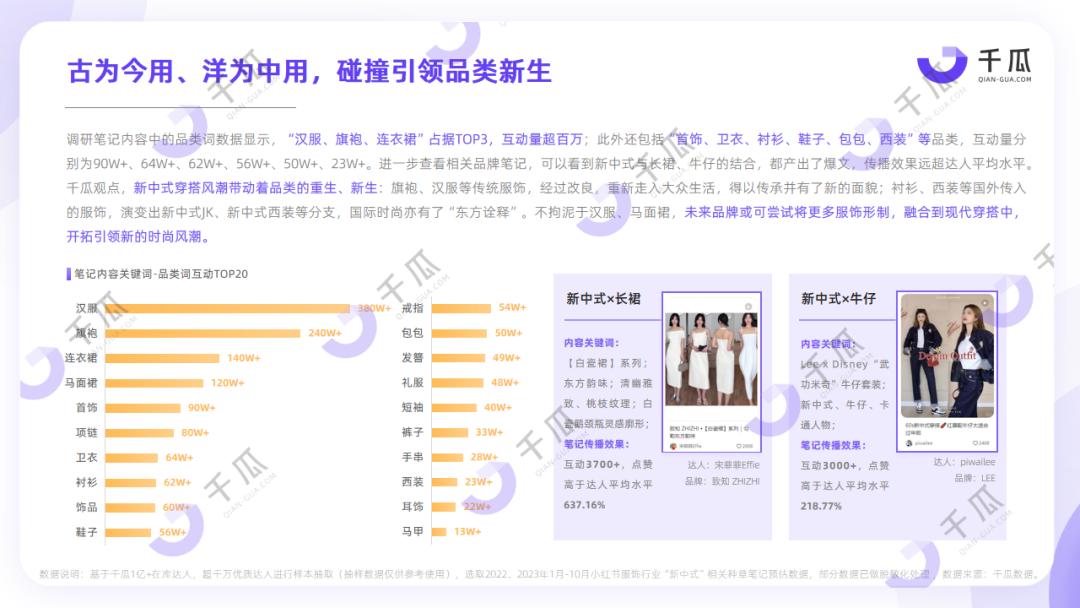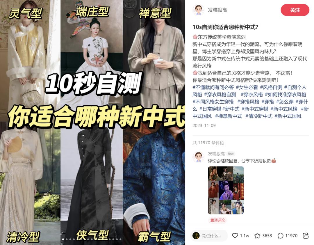 在小红书平台,千瓜数据显示,2023年小红书平台“新中式”相关笔记声量增长390%+,互动总量增长188%+,新中式相关种草笔记数较2022年同期增长110%+,月均笔记数过万,年互动总量超2000万。品牌投放的商业笔记数增长119.75%,商业互动增长56.46%。在小红书平台,#新中式词条目前已有38.7亿浏览;具体到“新中式穿搭”,热度最高的笔记已有超过15万点赞,过万点赞的笔记有数百条之多。