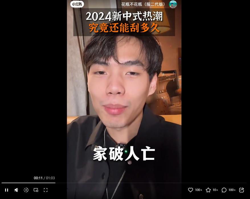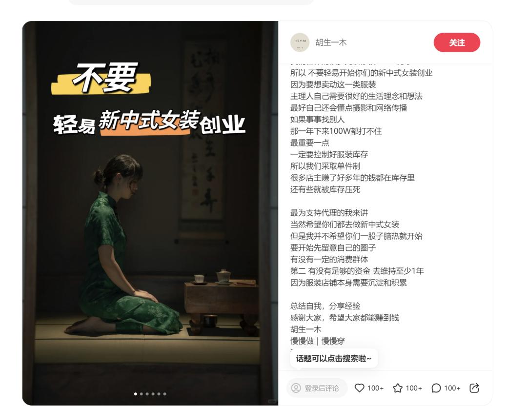 而在新中式服饰的实体店经营上,更要面临“烧钱”的风险。女装店主@胡杨一木分享自己的创业经历时表示,“新中式女装店一年下来100W都打不住”。他认为,新中式服饰的受众还比较小众且挑剔,新中式店铺对于质量、工艺甚至氛围感的要求,都需要店主比其他店铺进行更高昂的投入,并快速找到自己的消费群体。