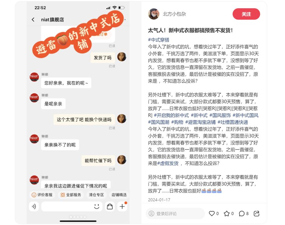 再次,“只预售不发货”搅浑市场。与此同时,越来越多的消费者观察到,很多新中式存在“预售不发货”现象。很多店铺的预售期限都在7-30天不等,更有消费者直言“店家根本没有衣服,在凑一波人才开始做,如果凑不齐就退货”。