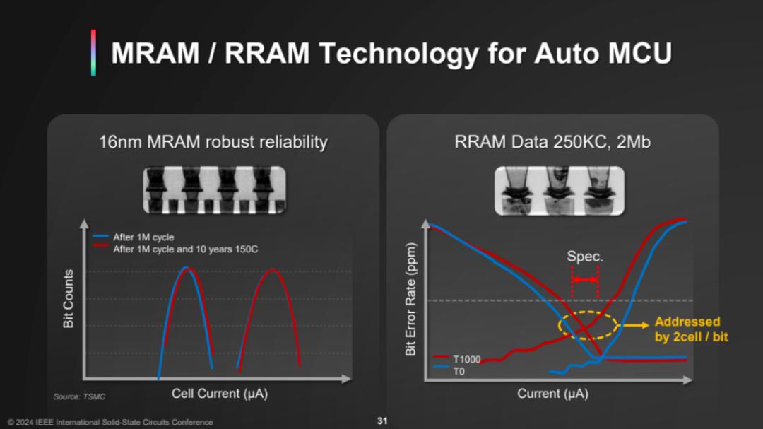 谈到MCU方面,MCU在汽车转型为区域架构后变更重要,也需要先进半导体技术给MCU 提供运算能力。传统MCU 大都采用浮动闸极(floating gate)为基础的技术,但浮动闸极技术在28 nm以下就卡关,所幸业界已经投资新内存技术,包括新的非挥发性存储器如磁性随机存取存储器(MRAM)或电阻式存储器(RRAM)。