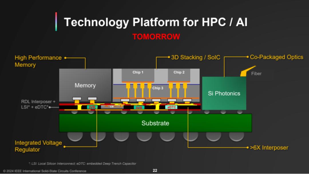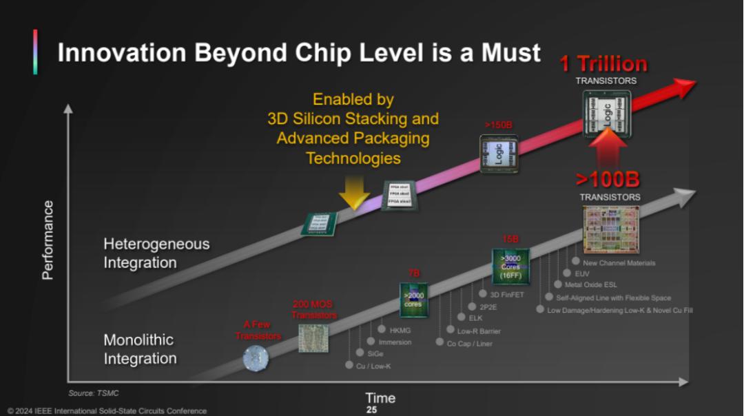 在ISSCC 2024上,台积电正式公布了其新的先进封装平台,该技术有望将晶体管数量从目前的1000亿提升到1万亿。