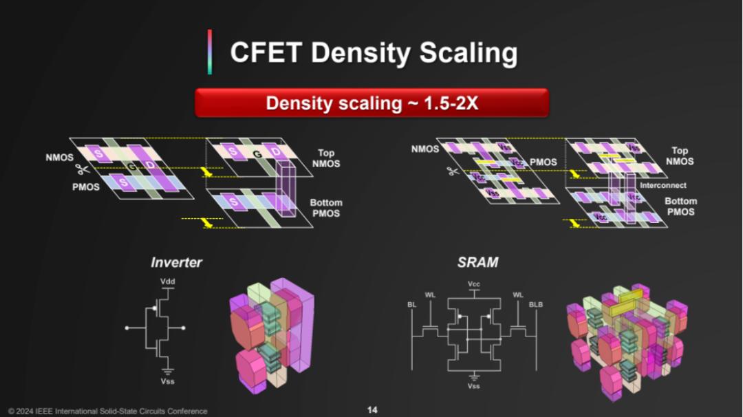 进一步了解CFET可以带来的好处,如上图可见,CFET(互补式场效晶体管CFET)是将nMOS和pMOS 垂直堆叠,可大幅改善零组件电流,使晶体管密度提升1.5~2 倍。