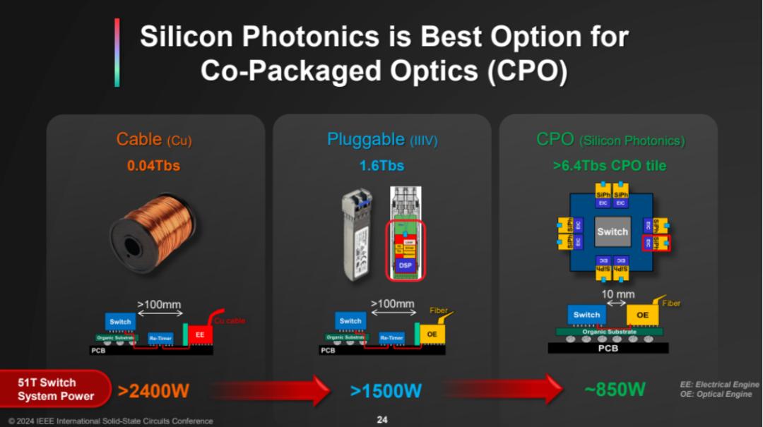 目前解决方案是采用插拔式模组(Pluggable),可省下40% 功耗(> 1500W),但随着未来需要更高速信号、更大频宽,这远远不够,因此需要把硅光子技术把光子能力带进来。使用共封装光学的先进封装技术来正确实现光子功能。