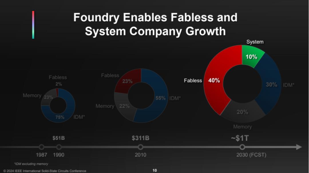 由于代工厂的引入,出现了很多新玩家。快进到2030年,如上图所见,超过50%的半导体收入由优秀的无晶圆公司、系统公司或云公司贡献。这些都是因为业务创新、代工厂的出现。
