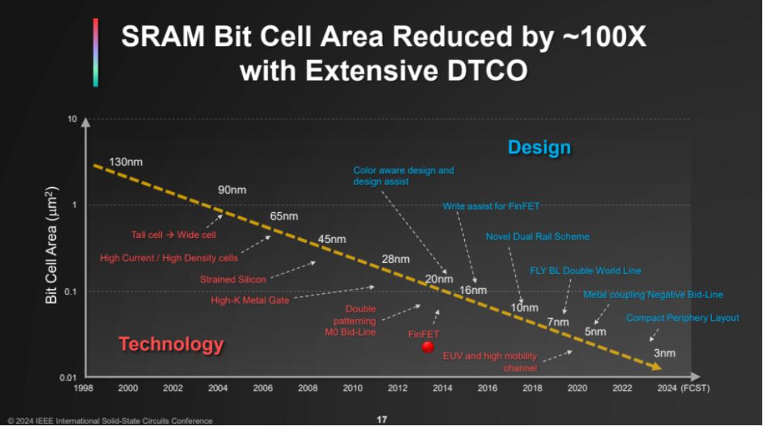 另一个很好的例子是SRAM位单元。上图展示了SRAM从130nm一直到今天的3nm,实现了超过100倍的密度提升,这种规模化实际上是流程创新和协作结合的成果,采用更先进的设计技术。
