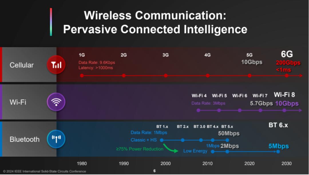 之后,Kevin Zhang也谈到了无线通信。通信在生活中非常的重要,上图展示了三种通信技术:蜂窝、WI-FI、蓝牙。正如所见,所有高级标准都需要更高的数据速率,更先进的信号处理,这将继续推动加速采用先进的技术,例如Wi-Fi 7。台积电今年也正在着手生产Wi-Fi 7的产品。从一开始,Wi-Fi 7的产品就必须采用7nm技术才能够达到功耗性能目标。