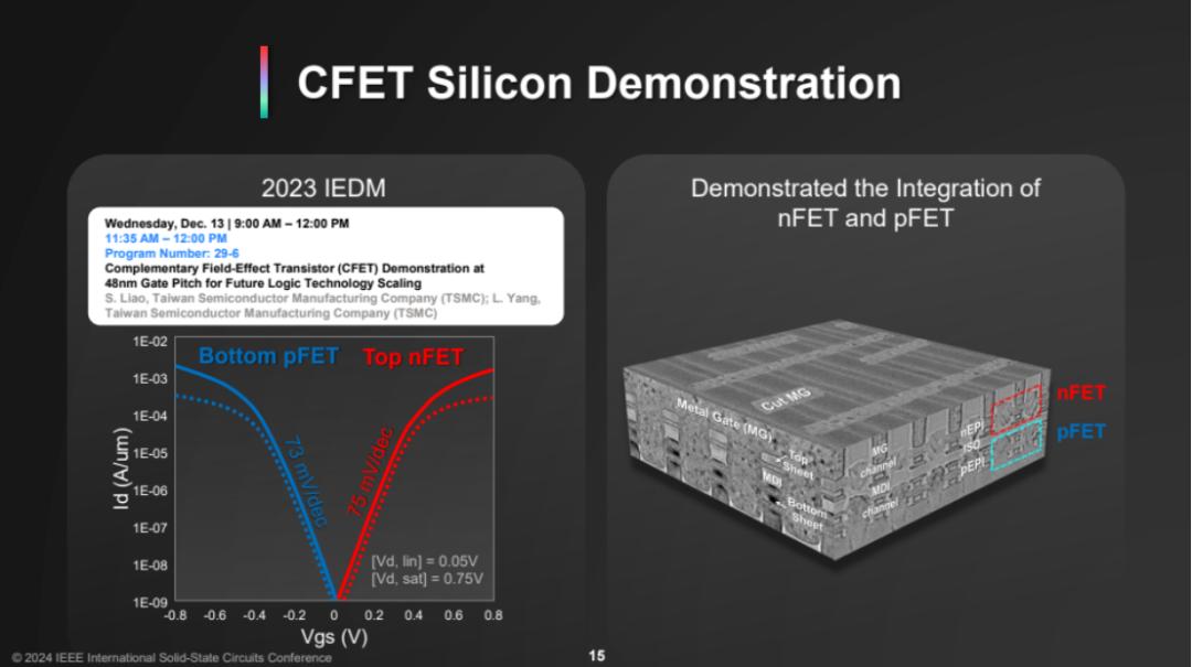 Kevin Zhang展示了一张图片,指出这并不是仅仅在PPT上的想法。从上图可以看到,这是台积电实验室制造的真正集成设备,还有晶体管IV优美的曲线。就推动创新而言,这是晶体管架构的一个重要里程碑。
