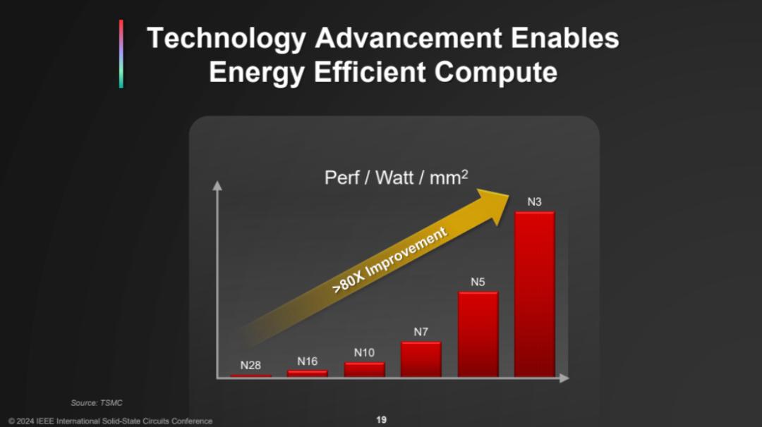 技术扩展的本质是为了节能计算。整个半导体行业走了很长一段路。上图展示十年多的规模,台积电实现了超过80倍的能源效率。