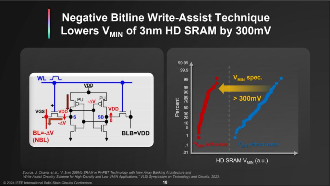 说到SRAM,就不得不谈到最低工作电压,或者说Vmin。在过去很长时间,为了降低电压,必须采用更大的存储单元。通过应用创新的设计技术,我们可以实现超过300毫伏的Vmin改善,这对于低功耗运行非常重要。