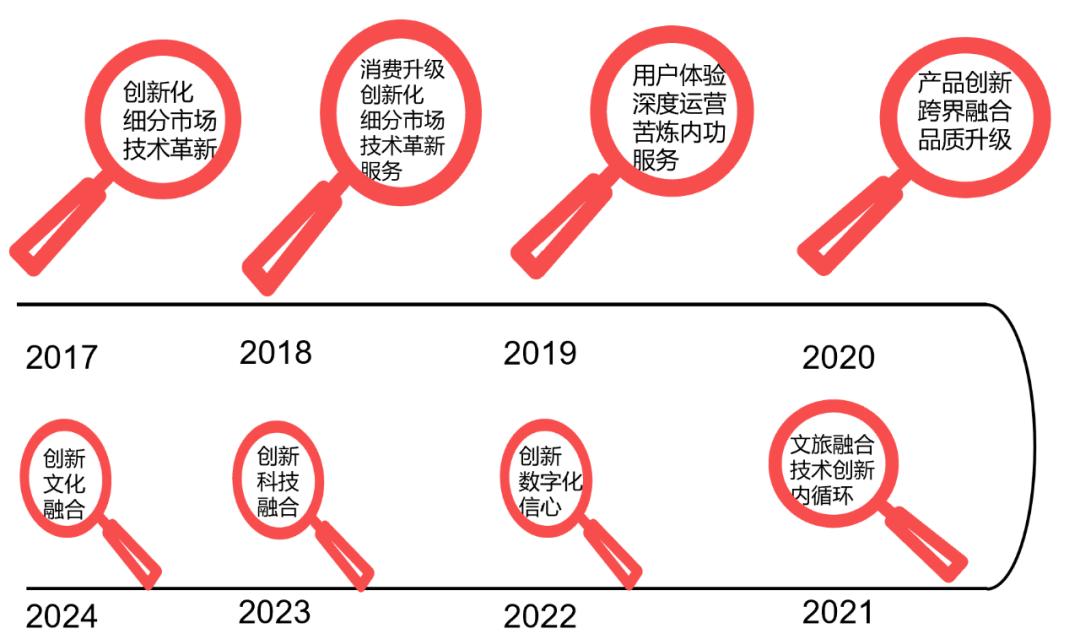 2017年的关键词为“创新化、细分市场、技术革新”,2018年的关键词为“消费升级、创新化、细分市场和技术革新服务”,2019年的关键词为“用户体验、深度运营、苦练内功和服务”,2020年的关键词为“产品创新、跨界融合、品质升级”,2021年的关键词为“文旅融合、技术创新和内循环”,2022年的关键词为“创新、数字化、信心”。2023年的关键词为“创新、科技、融合”,2024年的关键词为“创新、文化、融合”。(见图17)