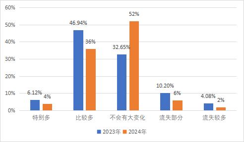 在文旅双创领域人才趋势方面,与2023年相比,今年的数据表现得不如去年乐观。预期进入文旅双创领域人才“特别多”和“比较多”的占比合计下降13.06%,“不会有太大变化”占比上升19.35%,而认为“流失部分”下降4.2%,“流失较多”下降2.08%。(见图7)
