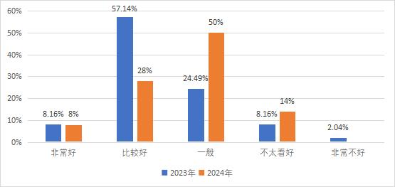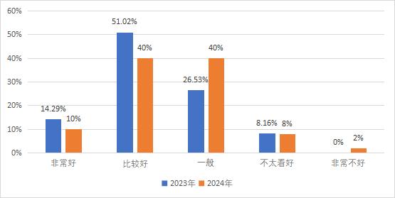 在资本对文旅双创的外部环境预期方面,数据整体不如2023年乐观。其中“一般”占比上升25.51%,上涨幅度较大,“不太看好”占比上升5.84%,“比较好”占比下降29.14%,“非常好”也有一定幅度的下降。(见图5)