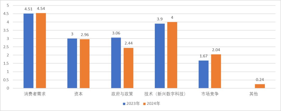 其次是技术(新兴数字科技)所得分值为4,资本因素和政府与政策因素的分值分别是2.96和2.44(见图3)。与2023年文旅双创驱动力相比,除资本因素和政府与政策因素有下降之外,所有因素的分值都呈上升趋势,上升幅度最大的是市场竞争因素,即专家认为2024年的文旅市场将继续保持繁荣,但竞争也将随之激烈,市场主体将在旅游资源、旅游产品、营销渠道以及品牌上展开竞争。