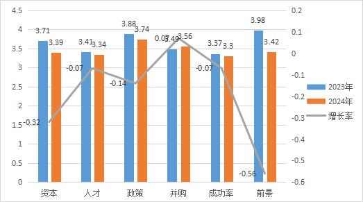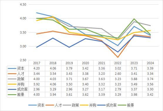 “资本”维度在前七年的数据中下降趋势明显,其中2022年数值最低,2023年的数值显著提升后,2024年又有下降。2023年,随着经济形势的变化,整个资本市场处于风险厌恶期,投融资活跃度下降超过80%,所以专家对资本的预期也有所下降。