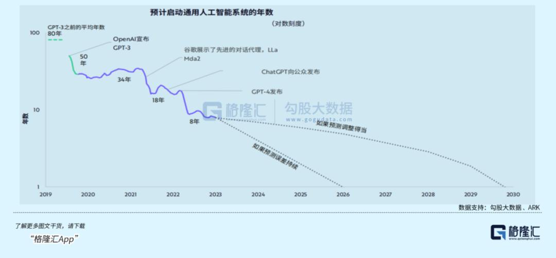 在2021年openAI发布chatGPT3.0版本时,木头姐的报告预计未来人类还要34年才能启动真正通用的AI系统。
