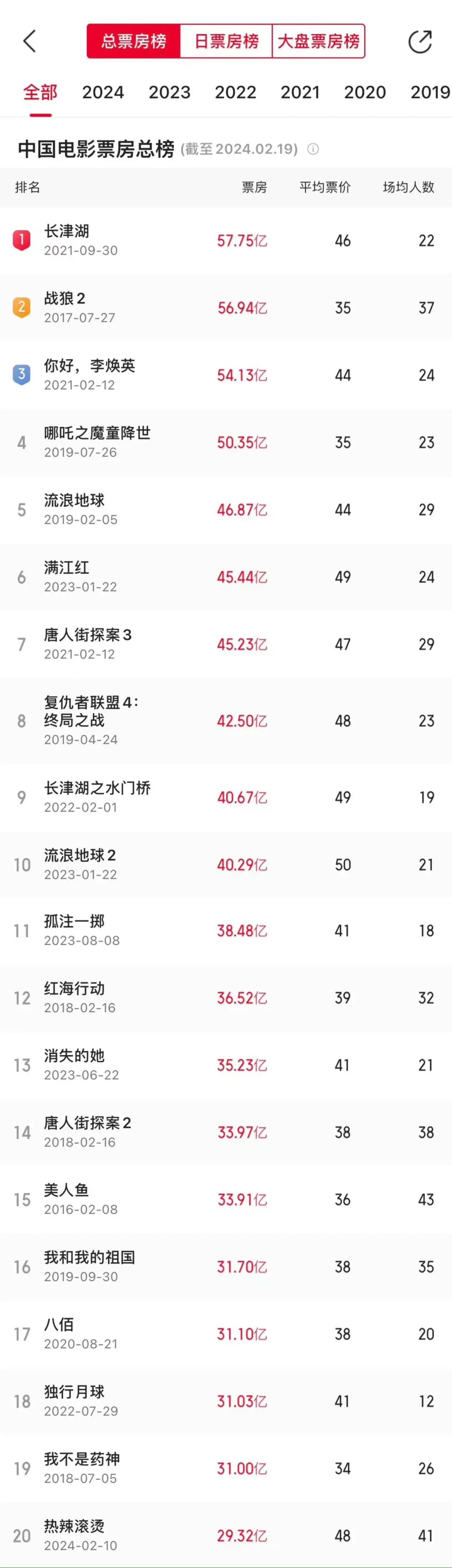 中国电影票房总榜(图源:猫眼)