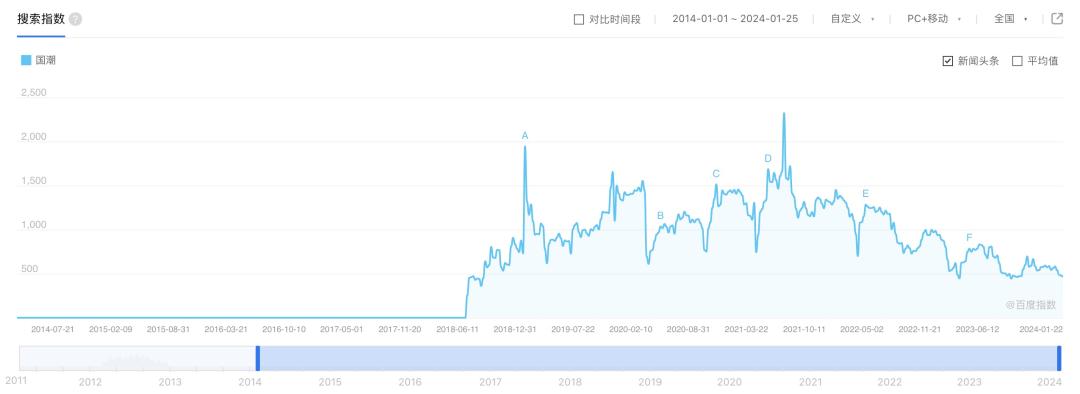“新中式”的红火,不禁让人回想起前几年曾经流行过的“国潮”。当时,电商平台也是争相提供热闹的数据,更有不少老品牌靠着“国潮”焕发第二春。不过,从2022年下半年起,“国潮”在消费领域的魔力逐步减弱,消费者不再为“国潮溢价”买账。百度指数也显示出“国潮”近一年来热度不断减退。