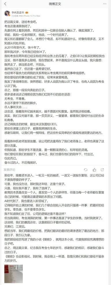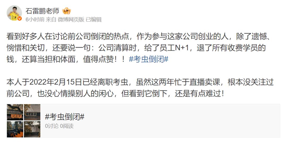 考虫倒闭消息传出后,两位前创始人也纷纷发表微博表示惋惜。