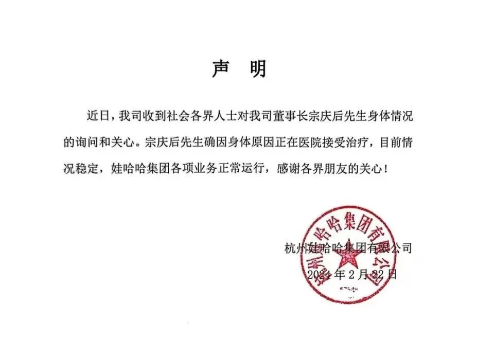 今天(2月22日)有消息称,娃哈哈创始人宗庆后正在ICU病房救治。随后,娃哈哈官方回应:“宗庆后先生确因身体原因正在医院接受治疗,目前情况稳定,娃哈哈集团各项业务正常运行,感谢各界朋友的关心!”