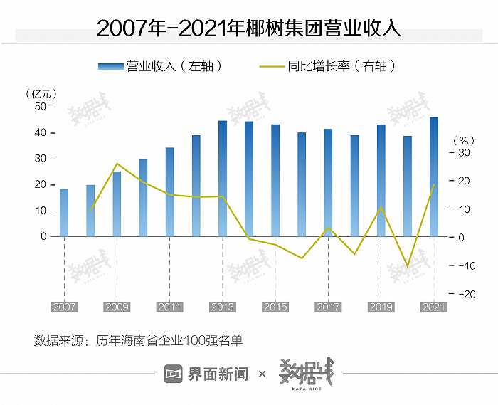根据历年海南省企业100强名单数据,2019-2022年,椰树集团营收分别为43.28亿元、39.89亿元、46.16亿元、47.19亿元。事实上,自2013年起椰树集团营业收入便一直徘徊在40亿左右,并且增速大幅放缓,甚至在5个年份出现负值。直到2021年,椰树才真正开始逆袭。