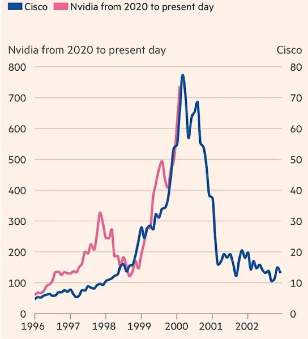 有人做了一张对比图,将思科从1996年到2002年的股价走势,与英伟达2020年至今的走势叠加在一起,发现有很大重合。