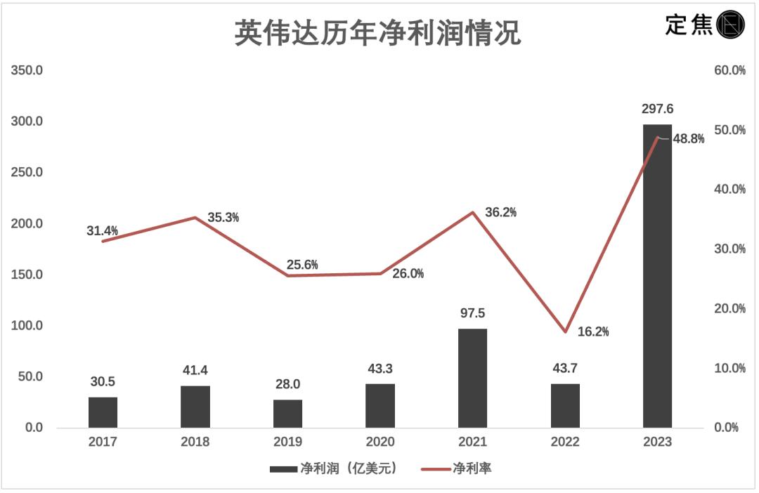 更夸张的是盈利能力。2023年,利润率更高的H100畅销,给英伟达带来巨额利润。公开信息显示,一颗H100售价高达3万美元,其成本不到5000美元。2023年英伟达净利润达到298亿美元,超过之前六年的总和,其毛利率为72.7%,净利率高达48.9%,远超同行。