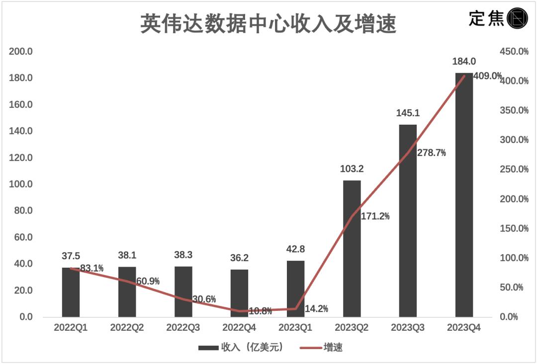 三季度,数据中心的收入增速更是高达279%,四季度飙升至409%。整个2023年,数据中心为英伟达贡献了474亿美元的收入,是游戏业务的4.5倍,其占总收入的比例上涨至78%,而总收入则增至609亿美元。