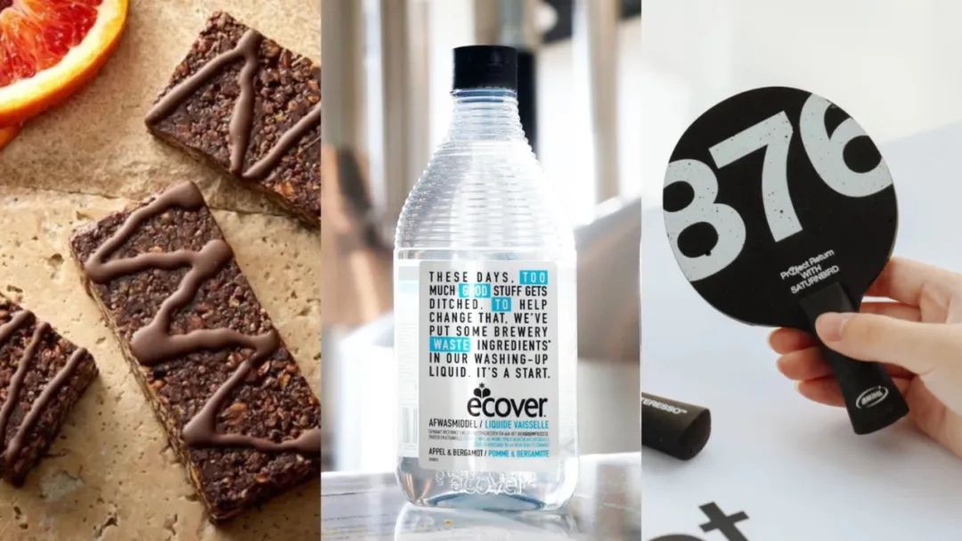 凯爱瑞用酒糟废弃物做蛋白质脆片,三顿半用咖啡渣做成乒乓球拍,百威英博把酿造无醇啤酒后的酒精做成洗涤剂,OATLY用剩余燕麦渣做成置物盒、手机套、杯套。