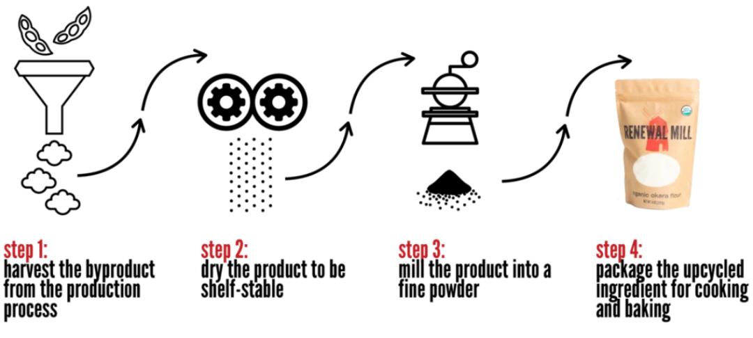 美国升级再造原料供应商Renewal Mill将生产豆奶、燕麦奶等产品的副产物—“豆渣”进行收集、脱水、干燥、研磨成粉,用于制作面粉和烘焙甜品。