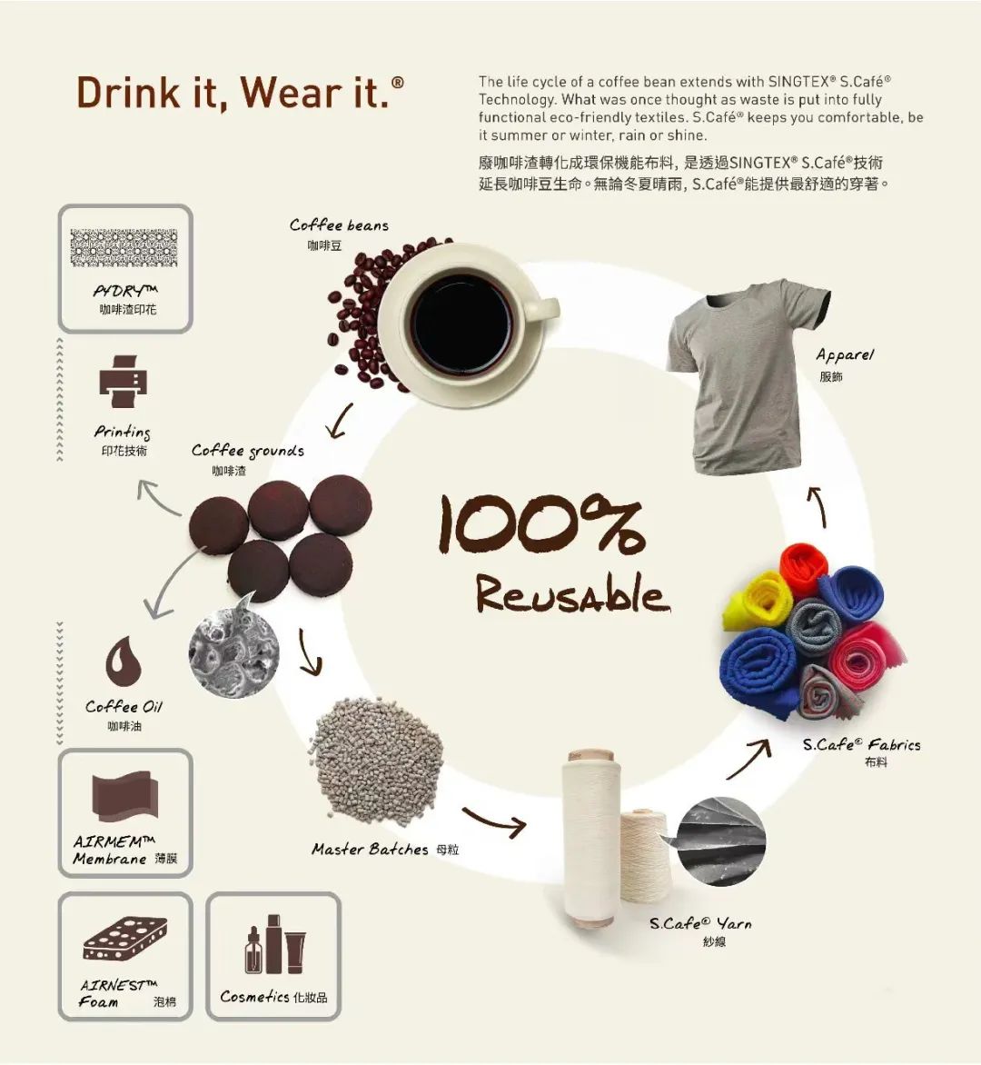 1989年成立的中国台湾羊毛供应商SINGTEX,创新地将咖啡渣融入纱线,打造出一款环境友好的专利纱线—S.Café®,这款专利产品在快速排汗、快干以及防紫外线方面,都有令人羡慕的功能性。