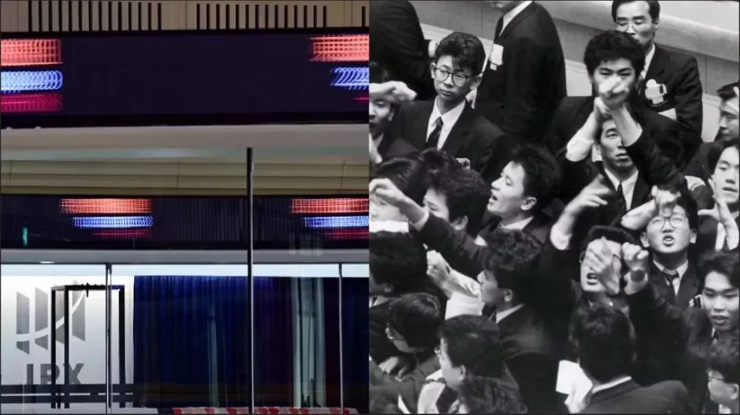 日本证券交易所的情况在泡沫经济崩溃后发生了巨大变化(右边为泡沫经济时期的交易大厅)