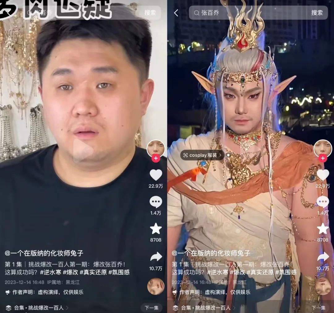 虽然存在些许争议,但“化妆师兔子”的《挑战爆改一百人》系列中已有10期视频在抖音点赞量超百万。