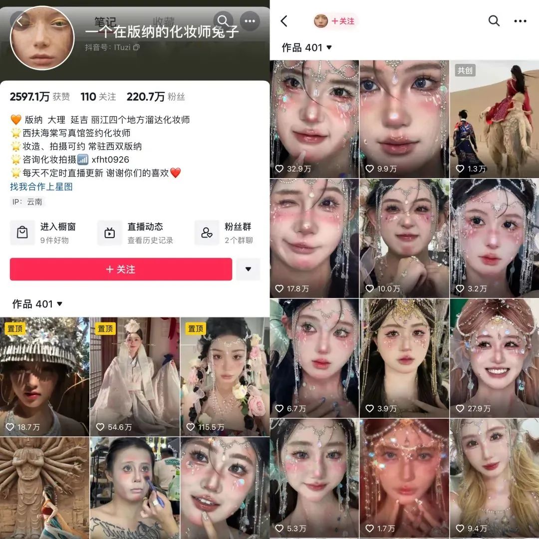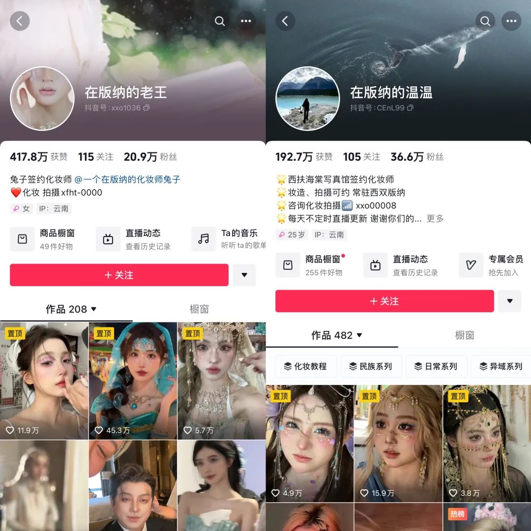 值得一提的是,与“化妆师兔子”同属一家写真馆的多个化妆师们的账号也以“在版纳的xx”这样的相似格式进行取名,而且也会分享爆改妆造视频,大有做成爆改矩阵号的趋势。