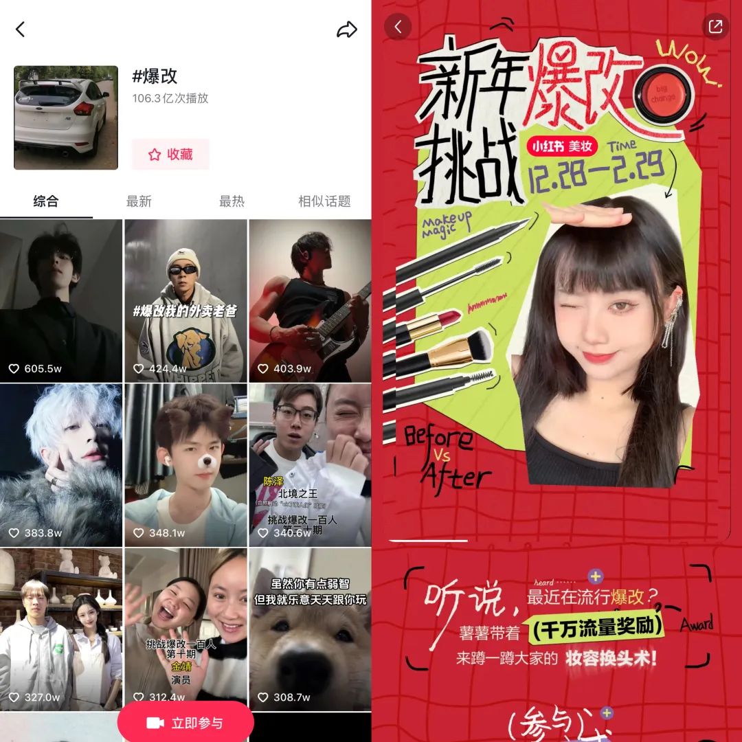 与此同时,内容平台也在顺应爆改风的趋势。截至目前,抖音上话题#爆改#的播放量已经达到106亿,小红书也于近期推出“新年爆改挑战”的站内活动。