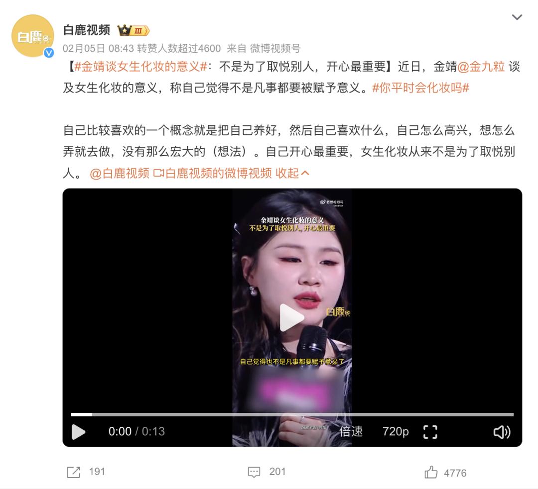 参与过爆改的金靖谈及女生化妆时表示,不是凡事都要被赋予意义,不是为了取悦别人,自己开心更重要。