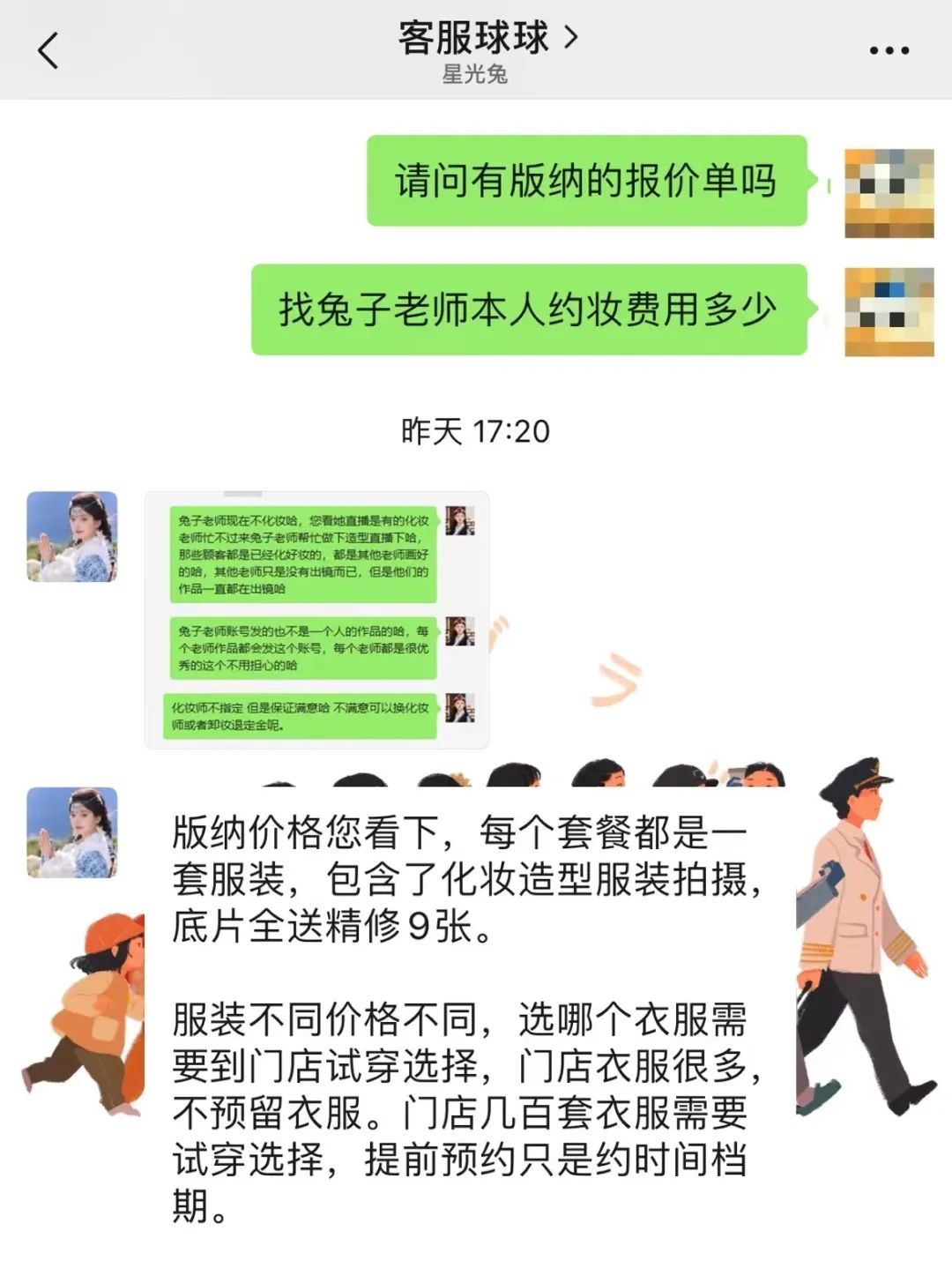 当我问及能否找“化妆师兔子”本人约妆时,该写真馆客服表示她现在不接受约妆,并且写真馆也不能提前指定化妆师。