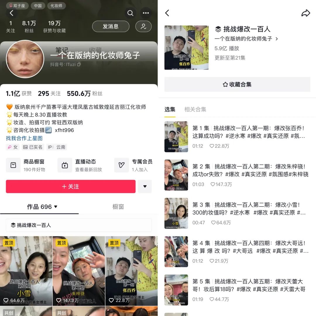 为他们操刀爆改的,是一位名为“一个在版纳的化妆师兔子”(下文简称“化妆师兔子”)的美妆博主,这些视频被她收录至《挑战爆改一百人》系列,截至目前已更新第45期,前21期的抖音播放量达到5.9亿。