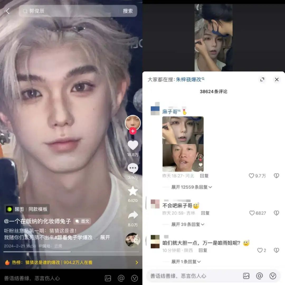 随着爆改群体从素人顾客延伸至千万粉博主、娱乐圈明星,“化妆师兔子”的内容讨论度也逐步破圈。