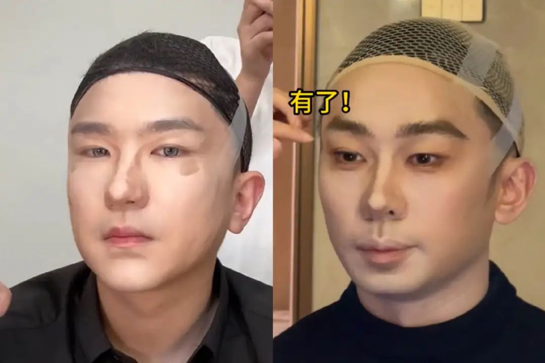 为了实现“爆改如换头”的效果,“化妆师兔子”经常会借助外部道具,对改造者的面部轮廓进行大开大合的调整, 张大大、杨迪都经历了相似的流程。