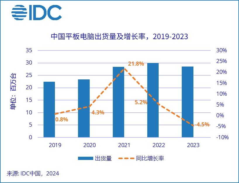 平板电脑和手机、PC 一样,目前都面临着市场容量饱和、出货量下滑的困境。IDC 发布的数据显示,自 2021 年起,中国平板电脑增长率就在连年下滑,2023 年中国平板电脑出货量同比下降 4.5%,仍处于下降趋势中。