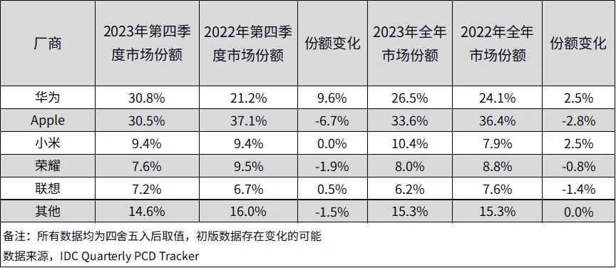 国际数据公司 IDC 发布的 2023 年第四季度中国平板电脑季度跟踪报告显示,华为时隔四年再次超越了苹果,成为中国平板电脑市场出货量第一。