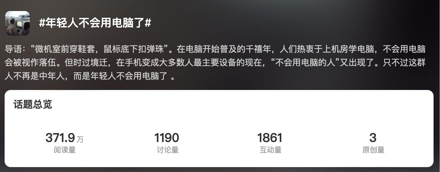 而手机网民超越电脑网民的「代价」也相当直观:手机、iPad、Android 平板成为了不少中国网民家里唯一的「计算设备」;越来越多年轻人只会用手机,对电脑操作一窍不通。在微博,「#年轻人不会用电脑了#」这一标签获得了超过 371 万的阅读量。部分刚刚走出学校的实习生甚至拒绝使用电脑工作,只会用手机做文字处理。