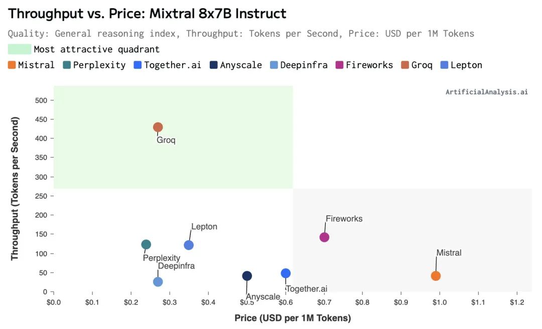 依据 ArtificialAnalysis.ai 数据显示,Groq 推出的 Mixtral 8x7B Instruct API,以每秒处理约 430 个 token 的速度,这刷新了业界吞吐量的历史记录。而且其每百万个 token 的价格仅为 0.27 美元,击败了 Mistral、Lepton 等。
