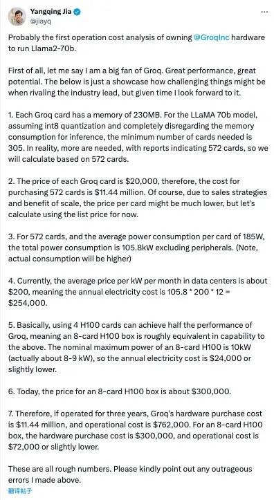 原 Meta 人工智能科学家、原阿里技术副总裁贾扬清做了一番估算,指出由于 Groq 的内存容量较小,在运行 LLaMa2 70B 模型时需要使用 305 张 Groq 卡,而使用 NVIDIA 的 H100 卡只需要 8 张。这相当于 Groq 的硬件成本大约是 H100 的 40 倍,而其能源成本则是 10 倍。