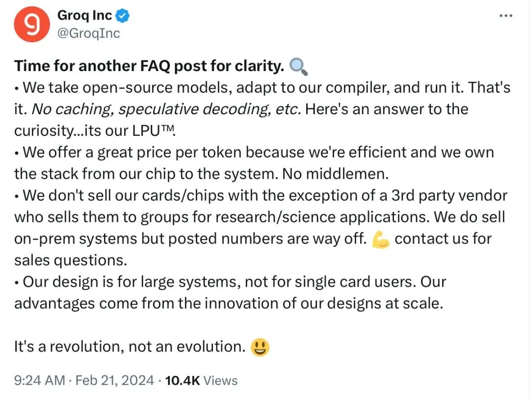 同时,Groq 还在社交平台上解答用户较为关心的问题: