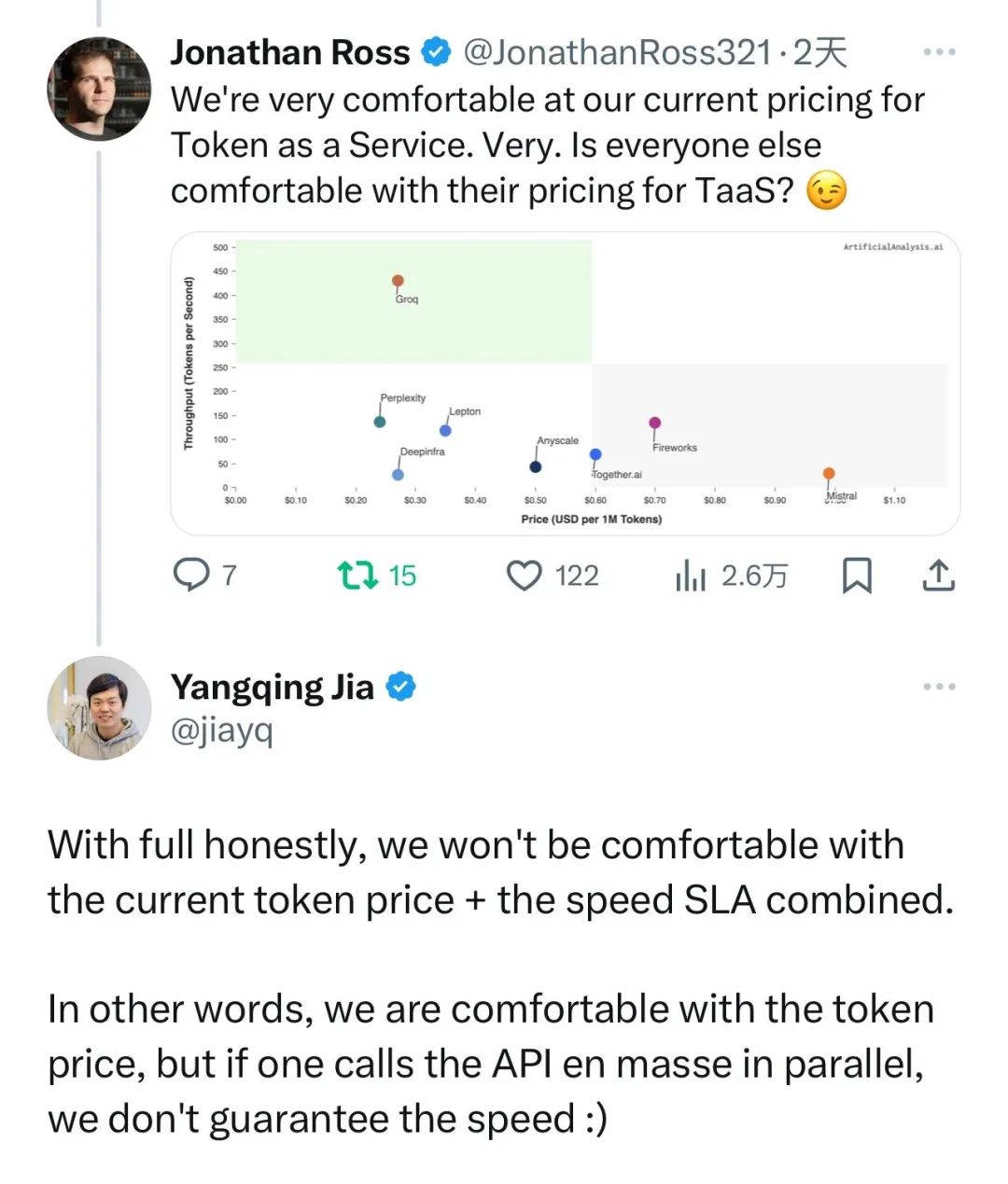 在这条 X 文字下,Groq 的CEO Jonathan Ross 回复到:“我们对当前的 token 即服务的定价感到非常满意。非常。其他人对 TaaS 的定价感到满意吗? ”