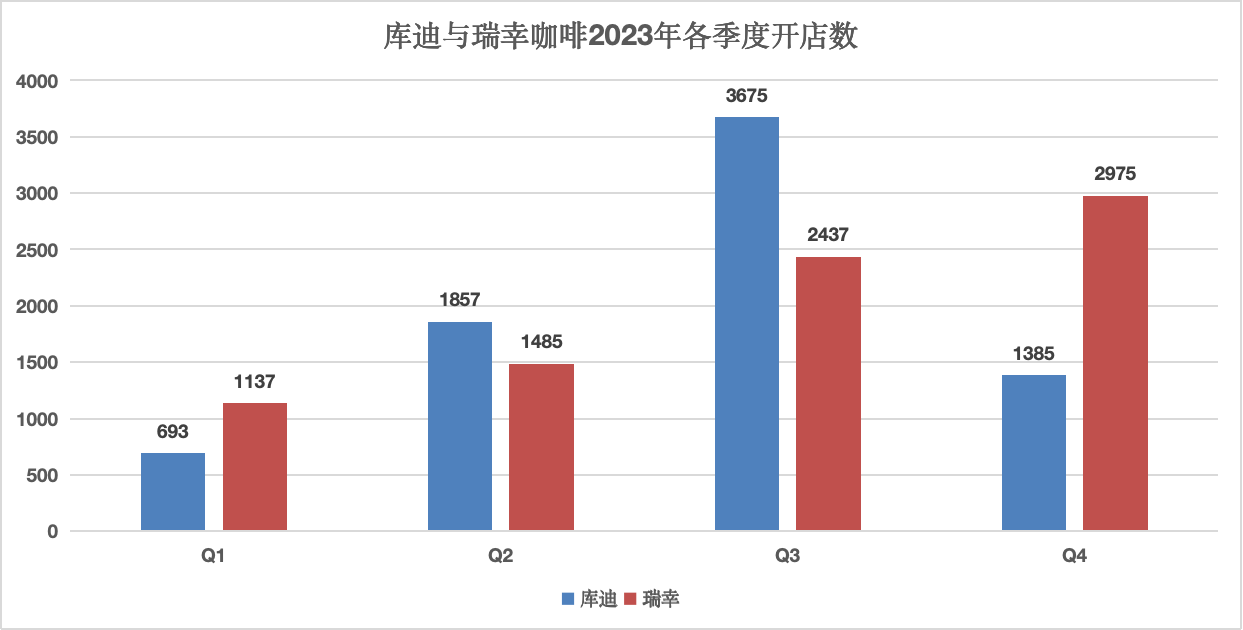 库迪与瑞幸咖啡2023年各季度开店数 数据来源:窄门餐眼、瑞幸财报