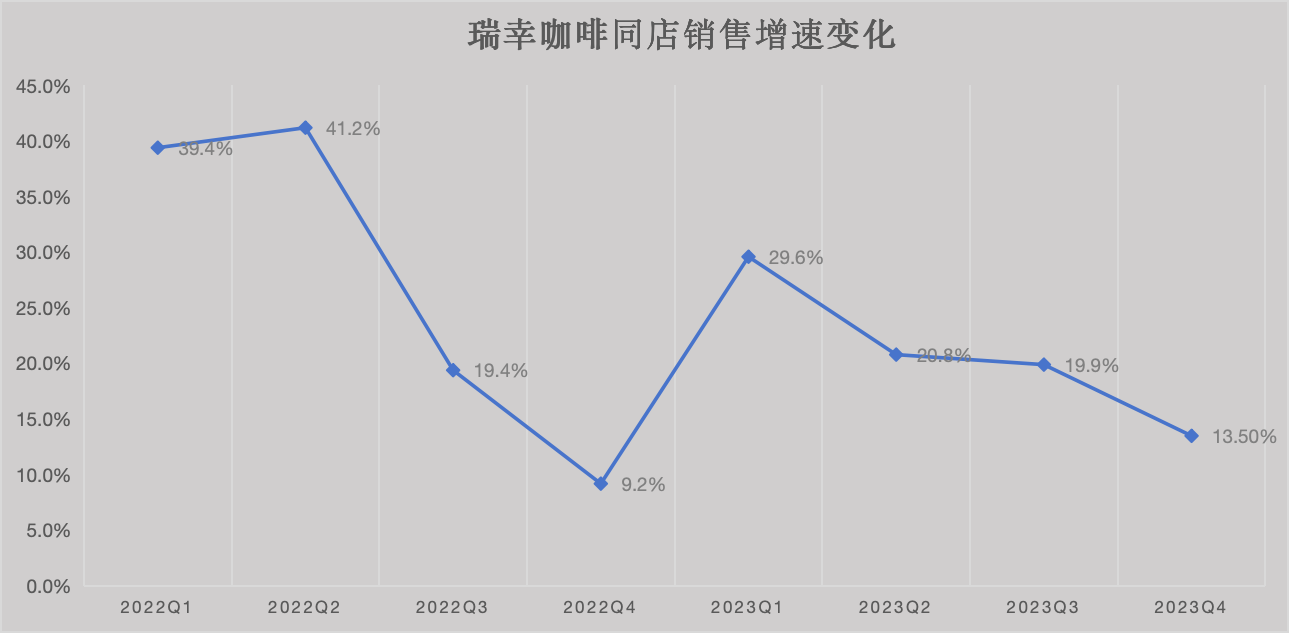 但高密度开店带来的负面影响也显而易见,最直接的表现就是同店销售增速的下滑,Q4瑞幸的这一数据跌到了除2022年Q4外,过去几年的最低水平,只有13.5%。